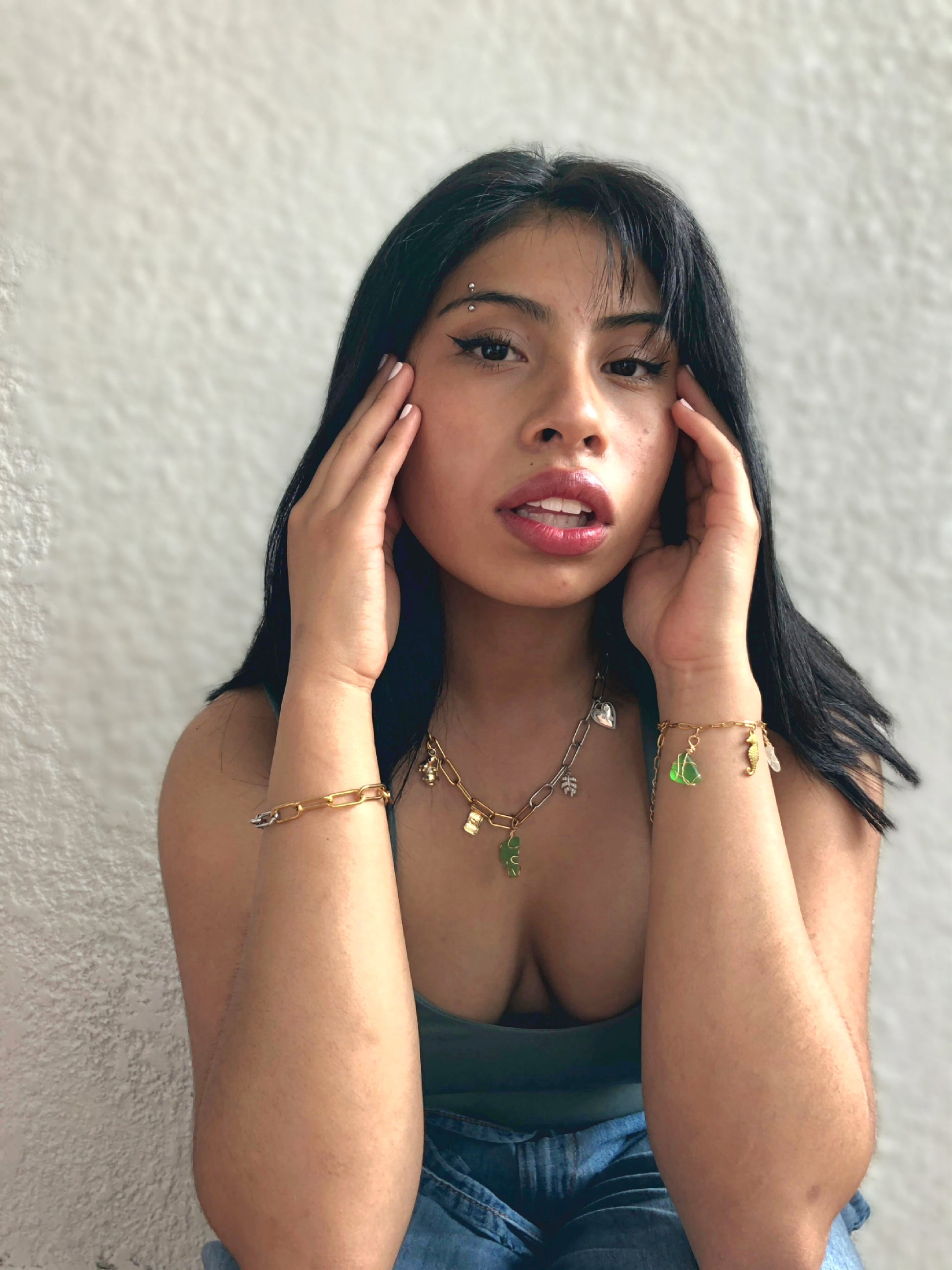 Hermoso collar con cadena plateada y dorada con 4 charms (Conejo, dolar, corazón y hoja) con piedra de mar decorada en alambrismo, ideal para elevar tus outfits